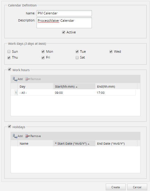 Calendars allow process designers to specify the hours and days when users are expected to be at work, so that the due dates for tasks can be more accurately calculated with Timing Controls. They also allow holidays to be specified, so those days are excluded when calculating the due date. Different calendars can be created for different needs. For instance, a calendar can be created that only includes workdays, but not holidays or weekends, which is useful for calculating salaries.