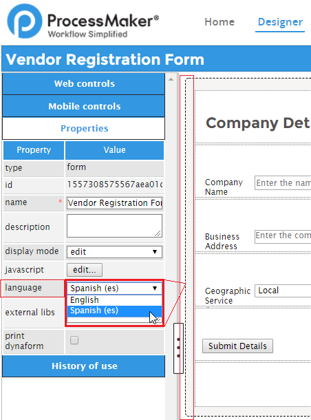 To demonstrate how to create a new file translated into different languages, the Dynaform used as an example is called "Vendor Registration Form" from the Vendor Registration process.