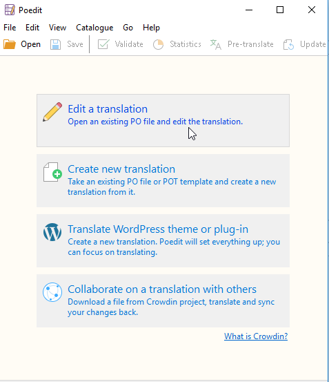 The new translation file can be created using a plain text editor or Poedit, an open source PO translation editor.