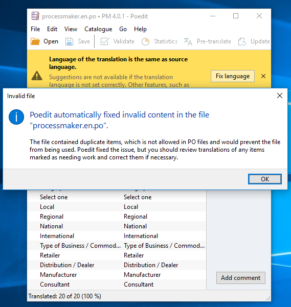 • 3. Poedit displays an Invalid file message. Click OK to continue.