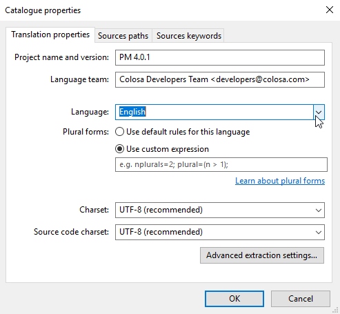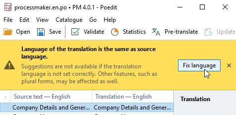 For example, if the URL is: http:/example.com/sysworkspace/pr-BR/neoclassic/cases/main Then, the .po file should have the following lines in the header: "X-Poedit-Language: Portuguese\n" "X-Poedit-Country: Brazil\n"