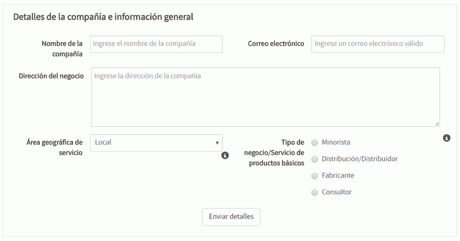 msgid "" msgstr "" "Project-Id-Version: PM 4.0.1\n" "POT-Creation-Date: \n" "PO-Revision-Date: 2010-12-02 11:44+0100 \n" "Last-Translator: Colosa\n" "Language-Team: Colosa Developers Team \n" "MIME-Version: 1.0\n" "Content-Type: text/plain; charset=utf-8\n" "Content-Transfer_Encoding: 8bit\n" "X-Poedit-Language: Spanish\n" "X-Poedit-Country: Bolivia\n" "X-Poedit-SourceCharset: utf-8\n" "Content-Transfer-Encoding: 8bit\n" "File-Name: processmaker.es.po\n" msgid "Company Details and General Information" msgstr "Detalles de la compañía e información general" msgid "Company Name" msgstr "Nombre de la compañía" msgid "Enter the name of the company" msgstr "Ingrese el nombre de la compañía" msgid "Email Address" msgstr "Correo electrónico" msgid "Enter a valid email" msgstr "Ingrese un correo electrónico válido" msgid "Business Address" msgstr "Dirección del negocio" msgid "Enter the company address" msgstr "Ingrese la dirección de la compañía" msgid "Geographic Service Area" msgstr "Área geográfica de servicio" msgid "Select one" msgstr "Seleccione una opción" msgid "Local" msgstr "Local" msgid "Regional" msgstr "Regional" msgid "National" msgstr "Nacional" msgid "International" msgstr "Internacional" msgid "Type of Business / Commodity Service" msgstr "Tipo de negocio/Servicio de productos básicos" msgid "Retailer" msgstr "Minorista" msgid "Distribution / Dealer" msgstr "Distribución/Distribuidor" msgid "Manufacturer" msgstr "Fabricante" msgid "Consultant" msgstr "Consultor" msgid "Submit Details" msgstr "Enviar detalles"