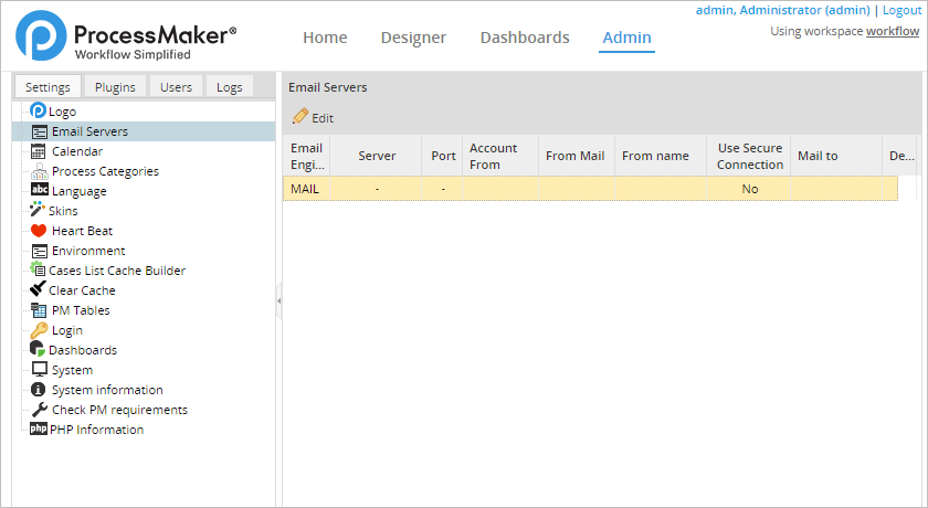 Then, to edit the Email Server configuration go to ADMIN > Settings > Email Servers and the following interface will appear.