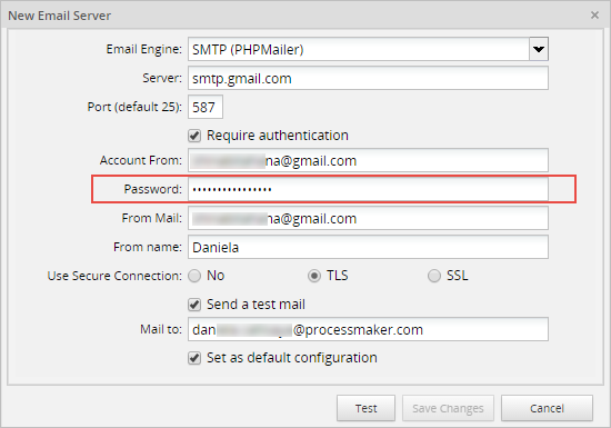 Now, go to the Email Server Configuration at ProcessMaker, and instead of your normal password place the 16-character code in the Password field.