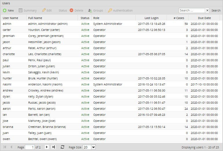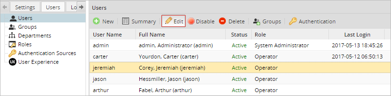 To see the profiles of any of these users, go to Admin > Users > Users, select a user and click on the Edit button.
