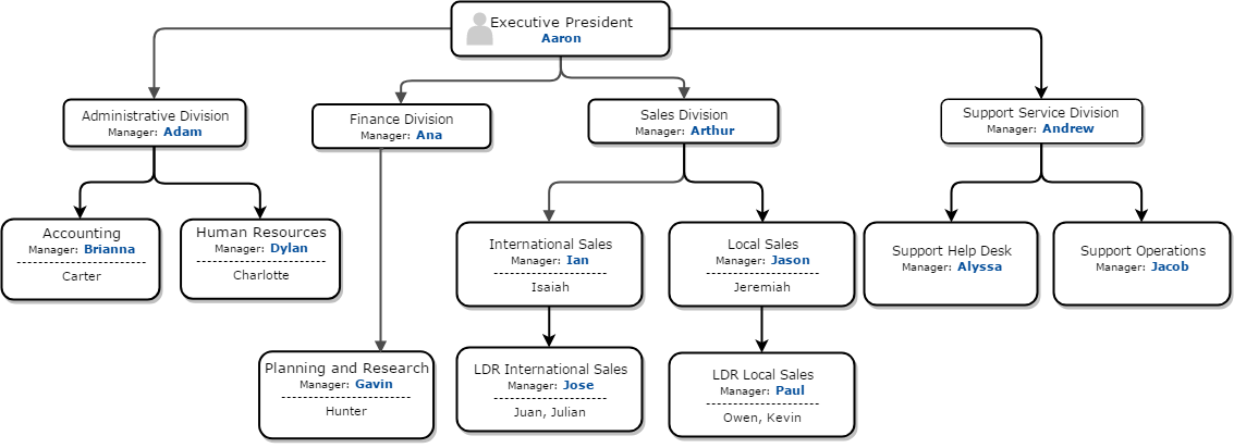 Each member reports to his/her superior in the chain of command. For example, a member of a sub-sub-department reports to his/her supervisor, who in turn reports to the manager of a sub-department, who then reports to the manager of the top-level department in the organization.