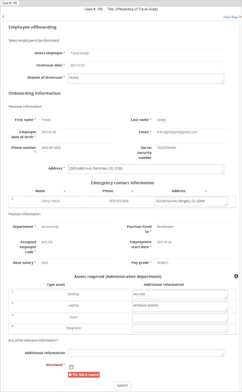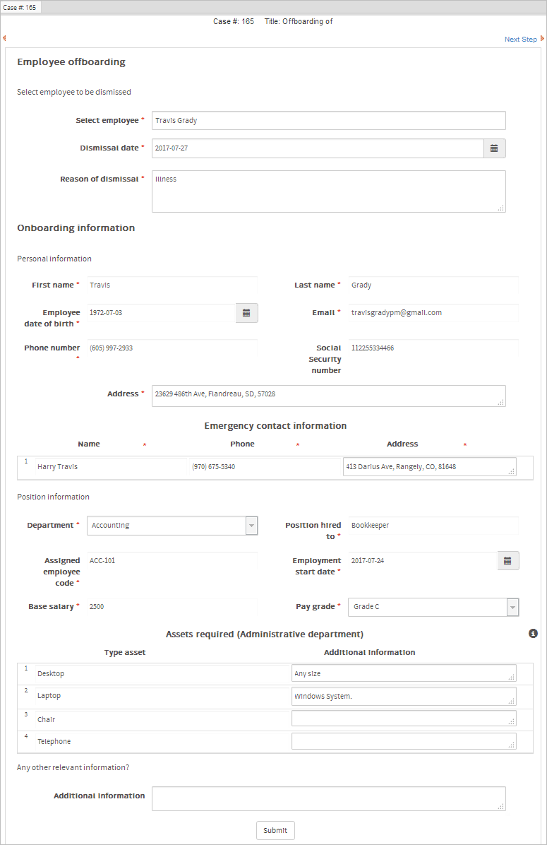Click on Submit to complete the case. The information stored in the PM table named EMPLOYEE_ONBOARDING will be updated and the status of the departing employee will be changed to "DISMISSED".