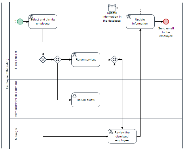 This process allows employees in a company to process out someone who is leaving the organization. The process is initiated by a member of the Human Resources department, who selects a user that was registered using the Employee Onboarding process. The process will display all the assets that were delivered to the employee to be collected. Then, the information will be reviewed by administration and by the manager of the departing employee. Once the information has been reviewed, the Human Resources user will update the information in the company's database.