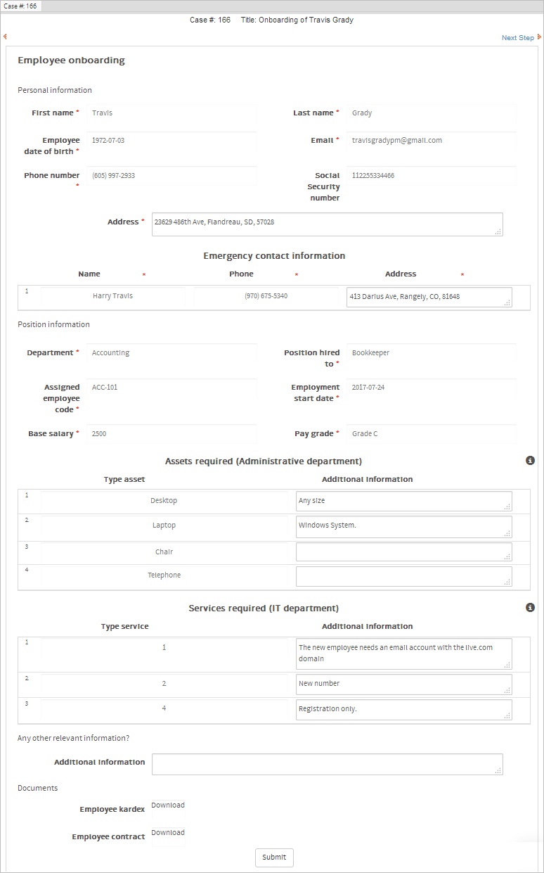 Once all the assets are provided and the form is submitted, the case will be routed to the Review Employee task and assigned to the manager of the new employee. In this example, the new employee named Travis has been hired to work in the Accounting department, so the case is assigned to Brianna.