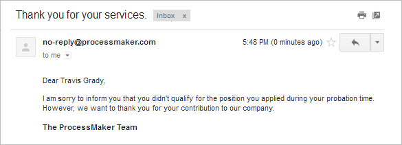On the other hand, if the manager decides that the new employee hasn't fullfilled all the expectations of his position, she can select the "No" option in the Approve employee dropdown. The case will finish and an email will be sent to the employee informing him/her that he/she didn't qualify for the position, as shown in the image below.