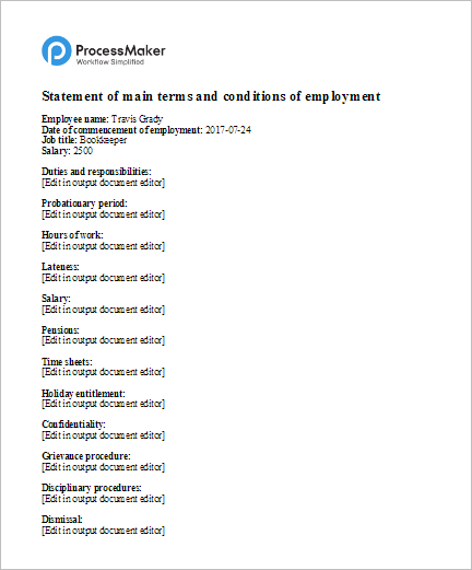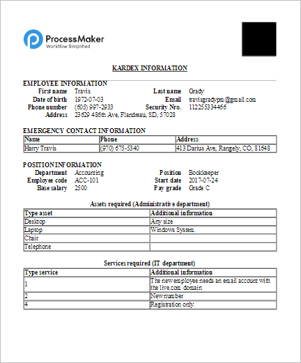 Log in as Dylan and review the case sent by Brianna. The Dynaform assigned in this task displays all the information about the new employee, along with the assets and services assigned to them during the probationary period. The Human Resources's user can download the new employee's kardex and contract in the Documents section. These documents are automatically generated with the information collected throughtout the process.