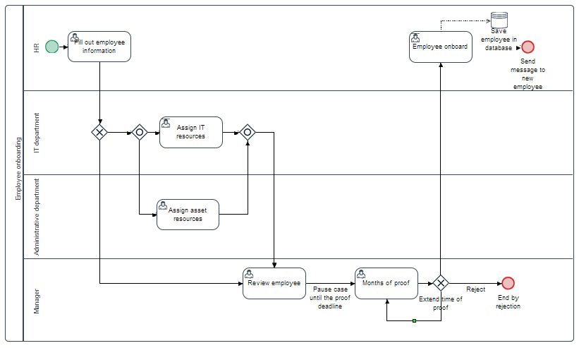 The Employee Onboarding process begins when a new employee is registered by the Human Resources department. A request is sent to the Administration and IT Help Desk to make sure that the new employee's physical environment, such as computer or desk, is ready for the new hire. The new employee's manager determines a probationary period to see if the employee is able to handle the duties associated with their new job position. After the probationary period, if the new hire's work is approved by the manager, their information will be saved into the company's database, and a contract and kardex will be generated automatically.