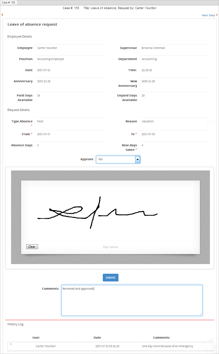 Log in as Brianna and review the new information filled in by Carter. The supervisor can approve or reject the amount entered in the Real days taken field in the History Log section. In this example, Brianna will approve the new information, so she selects "Yes" in the Approve dropdown, fills in a comment and puts her signature in the box under the Approve dropdown.
