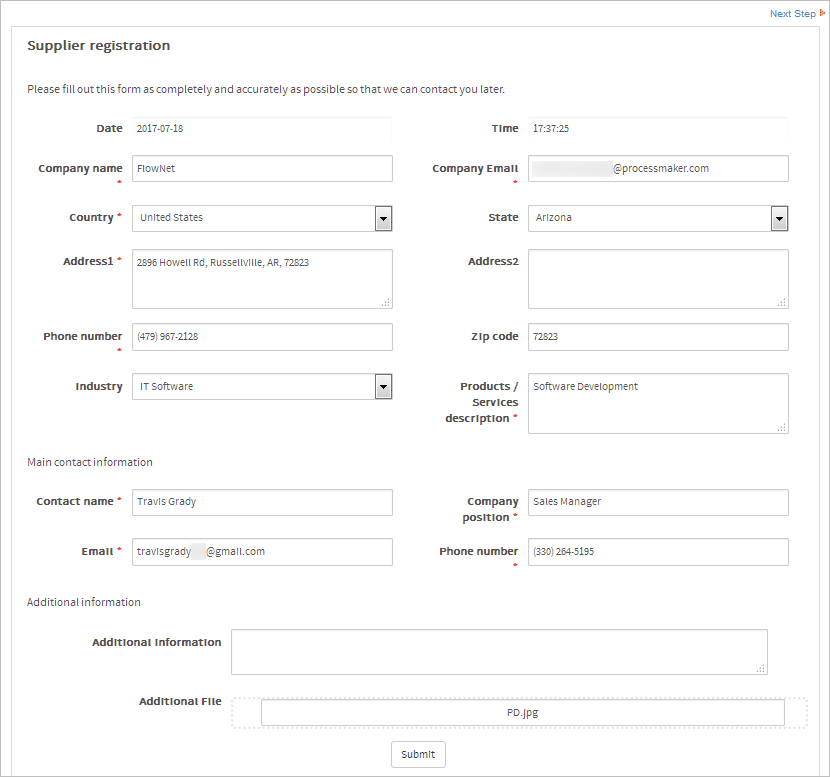 The supplier accesses the web entry link and fills in the Supplier Registration form, which is divided in three sections. The first section is where the supplier fills in the company details, the main contact information section, and the Additional Information section, where the supplier can include more information about his company and upload a file to promote the company's services.