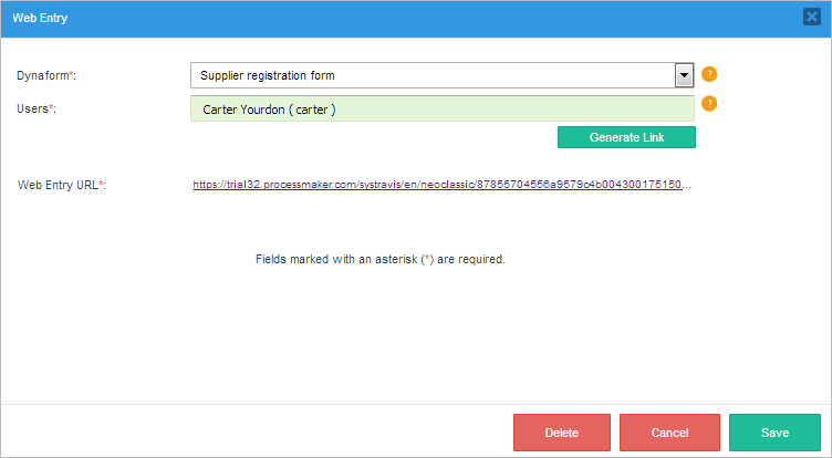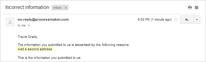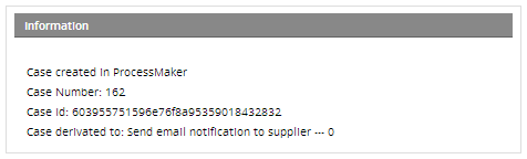 The case will be routed to the Add new information task where the assigned user must add or correct the information in the Dynaform using additional information provided by the supplier. If the supplier doesn't respond to the email and provide additional information, the user can reject the request and the case will finish, sending an email notification to the supplier.