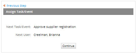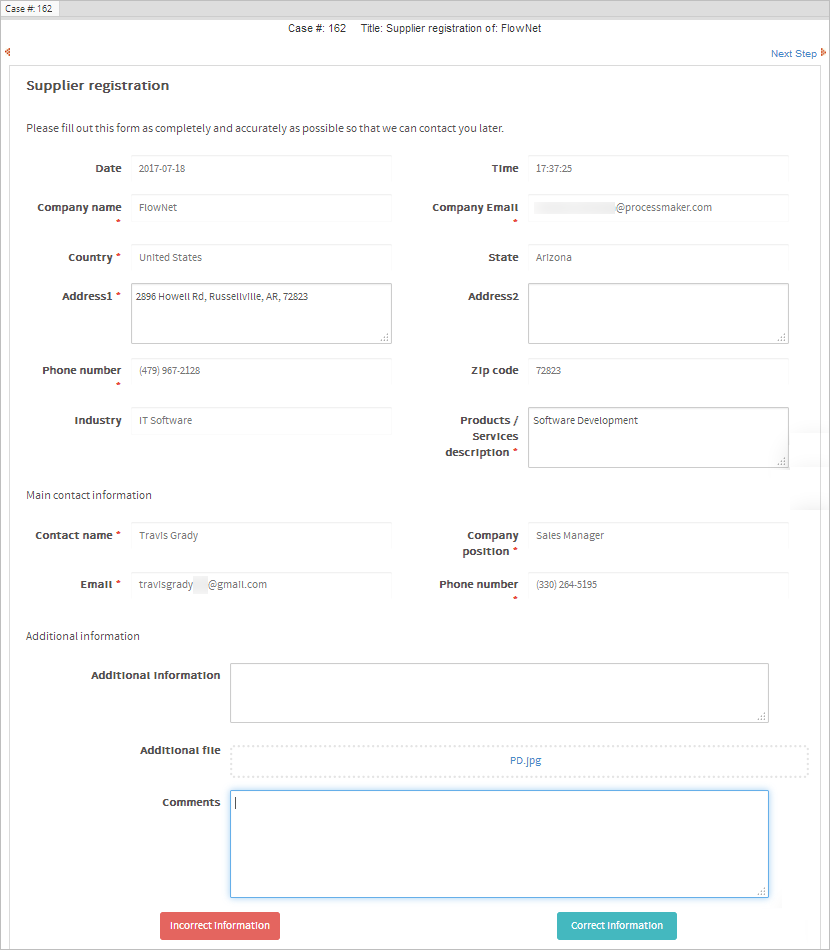 In this example, Carter will approve the information provided by clicking the Correct Information button. The case will be routed to the Approve supplier registration task, which is assigned to the reviewer's supervisor. Carter is a member of the Accounting department and Brianna is his's supervisor.