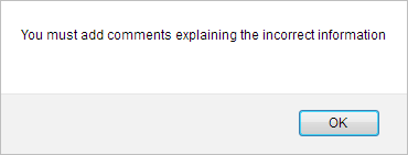 In the case he determines that the information provided is incomplete or incorrect, he can add a comment explaining his decision in the Comments field and click the Incorrect Information button. If he does not provide a reason, the following dialog window will be displayed: