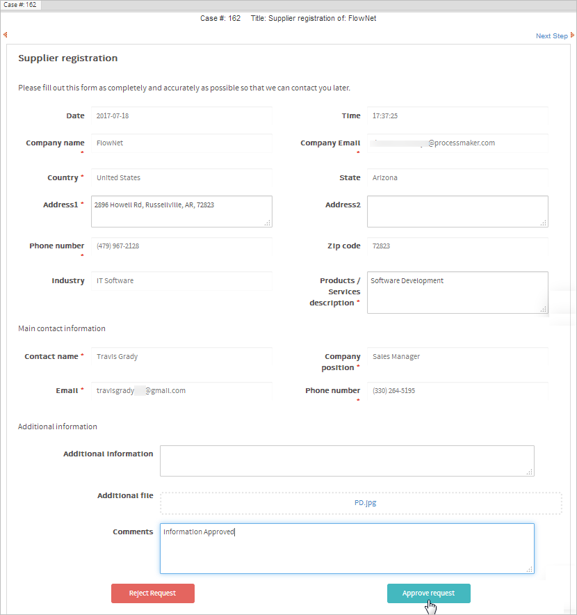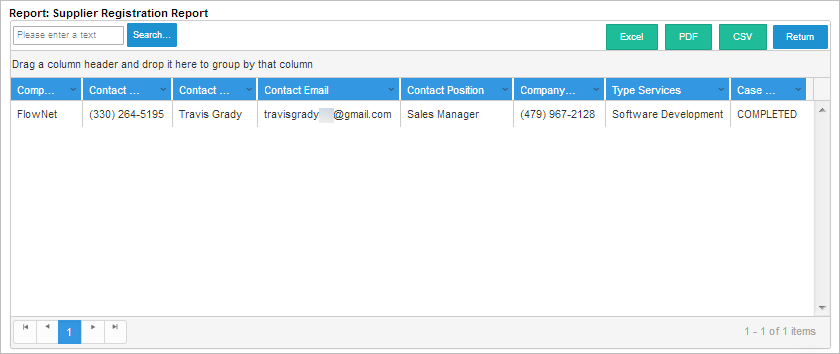 The Supplier Registration report shows all requests that have been filled in. This report is generated using ProcessMaker's Data Reporting Tools plugin.