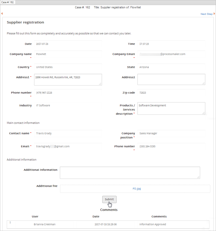 Log in as Brianna to review the request sent by Carter. Like the Dynaform in the previous task, the supplier's information will be displayed in read-only mode. The supervisor will review the information and decide if the request is approved or rejected. Note that the supervisor must add a comment to the Comments field before selecting an option.