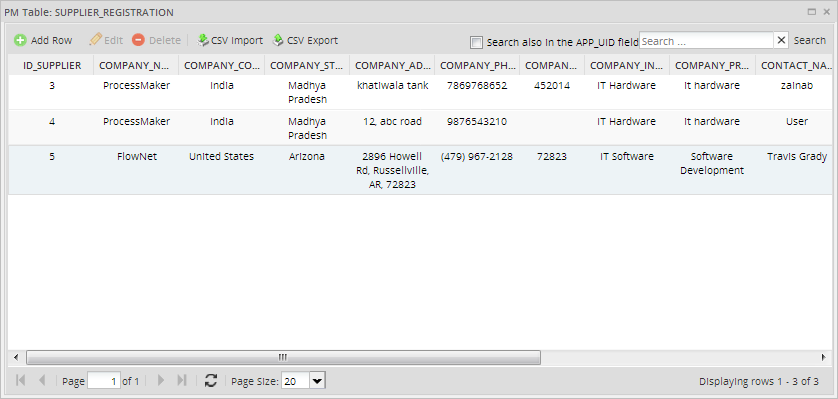 Once the Dynaform is submitted, the case is complete and the information is added to the PM table named SUPPLIER_REGISTRATION, as shown in the image below.