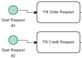 If a process needs to begin with different activities, it is possible to design processes with multiple start events. For example, in the process to request supplies shown below, the user can request credit in the"Request Credit" task, or directly request the supply in the “Request Supply” task.