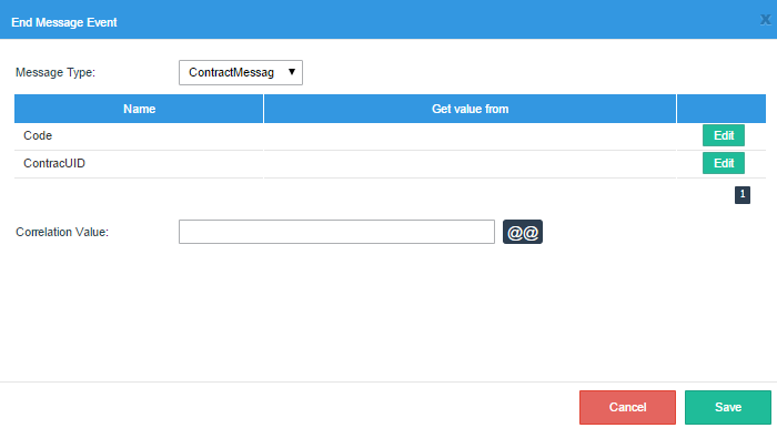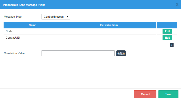 • Get Value From: In this column, define the variables used in the process where the values will be obtained and used by the message that will be sent to the other process.