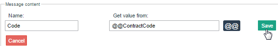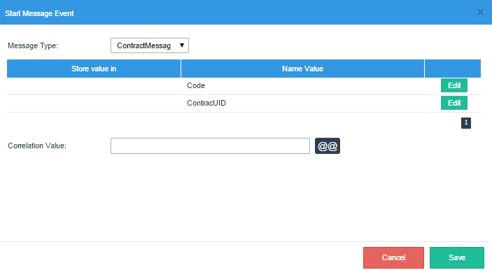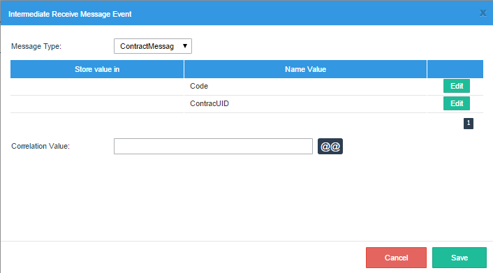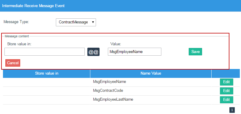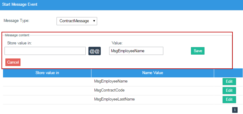 • Store Value In: In this column, define the value of the process variables that will receive the message from the other process. Each variable in the message can be assigned to a correlative existing variable in the process. To correlate these variables, click on Edit and the Message Content Section will be displayed: