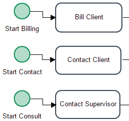 It is also possible to assign the same user to multiple starting tasks. For example, a user who handles billing might need to decide whether to send a bill, contact the client or consult the supervisor in the following process.