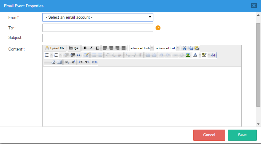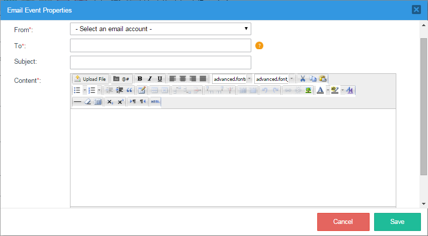 • From: Required Field. Lists the available email accounts registered in the workspace configuration in the dropdown menu.