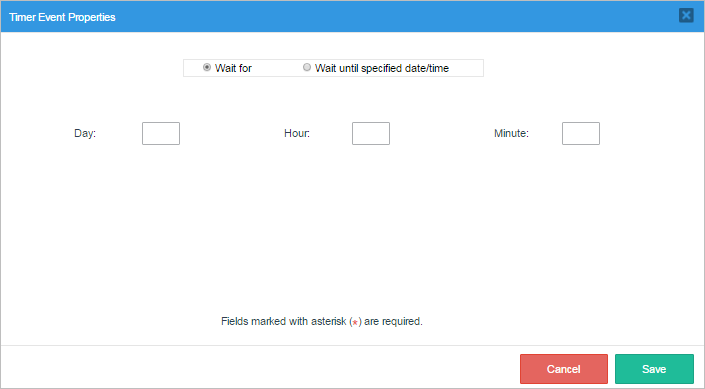 • Wait for: Select the number of minutes, hours, or days the flow must wait. At least one of these fields must be selected (minute, hour or day). The wait status begins when the flow arrives at the intermediate timer event.