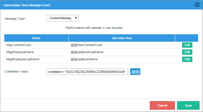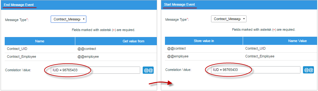 This value must be the same in both events. The correlation value must be either a fixed value, such as IUD = 98765433 (for example), or an unchangeable variable used in the project whose value does not change for both processes, such as @@USER_LOGGED (in the case the processes are assigned to the same user). Previously created process or system variables can not be used in this type of process since this event starts the flow of the process, and those variables do not yet have a defined value.