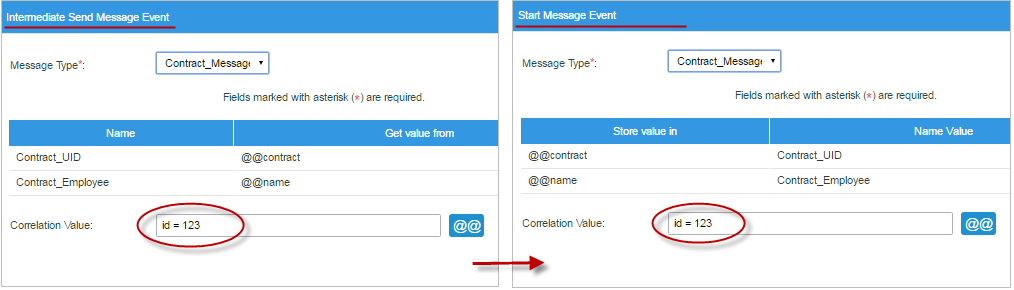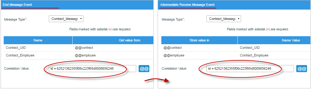 This value must be the same in both events. The correlation value must be either a fixed value, such as id = 62521362355f06c223f95d8008656248 (for example), or an unchangeable variable used in the project whose value does not change for both processes, such as @@USER_LOGGED (in the case the processes are assigned to the same user).
