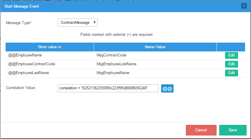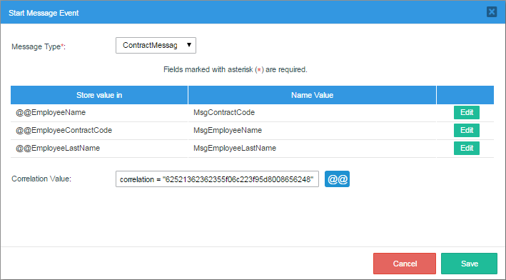 This value must be the same in both events. The correlation value must be either a fixed value, such as correlation = 62521362355f06c223f95d8008656248 (for example), or an unchangeable variable used in the project whose value does not change for both processes, such as @@USER_LOGGED (in the case the processes are assigned to the same user). Previously created process or system variables can not be used in this type of process since this event starts the flow of the process, and those variables do not yet have a defined value.