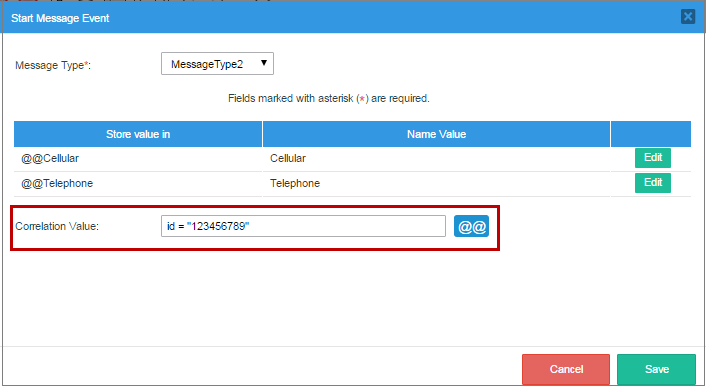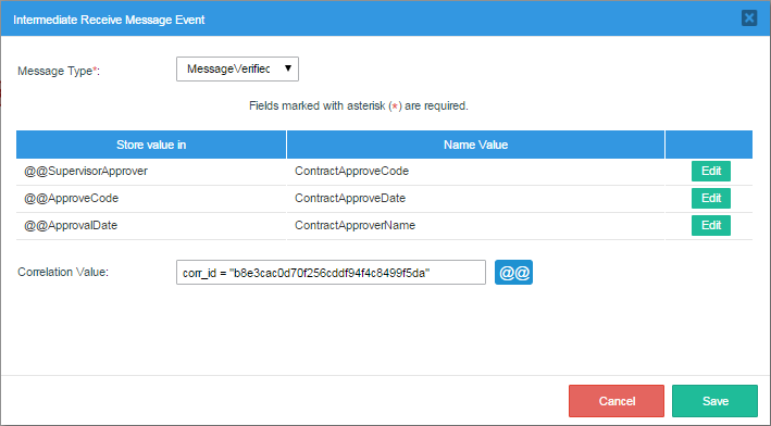 • Correlation Value: The correlation value defines the unique ID that will relate both events: the send message event and the receive message event.