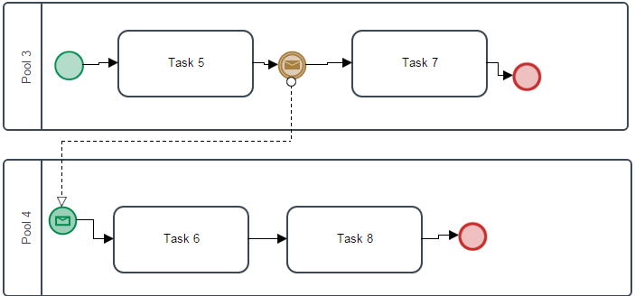 After executing "Task 5" of the first process, the Send Message intermediate event will send a message to the Receive Message start event to start the execution of the second process in "Task 6". To do this, both events are configured as follows: