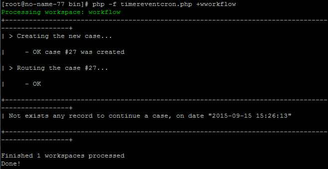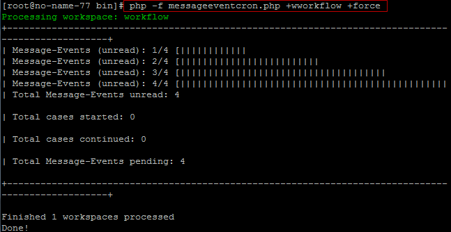 To start the pending cases of the second process run messageeventcron.php. The message shown should look like the following: