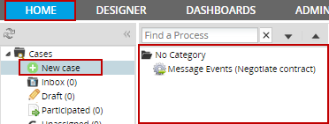 Now, let's run a case of the process. Take into account that this example is only intended to show how the events work between two processes. To start the process go to Home > New Case > Contracting Process (Negotiate Process)