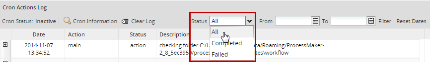 The contents of the cron log are available under the Admin menu. The cron log can be checked after cron is executed to see the results for a specific workspace or for all workspaces. Only users such as the "admin" who have the PM_SETUP_ADVANCE permission in their roles have access to the cron log.