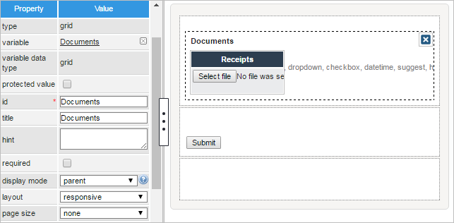 First, create the first DynaForm from where the user will upload files. Inside this DynaForm place a grid with the name and variable "Documents". Inside this grid place a file control named "Receipts".