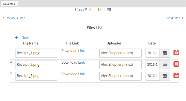Each one of these files will be listed with a link to be downloaded, the username who uploaded and date when the file was uploaded in the second DynaForm grid: