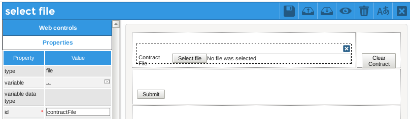For this example add a "file" control by dragging and dropping it onto the Dynaform Designer, from the Web Controls panel. The result of adding this kind of control is shown in the image below.