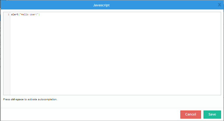 A editor window opens where the JavaScript code must be added. For example, let's add a simple alert when the form is loaded: