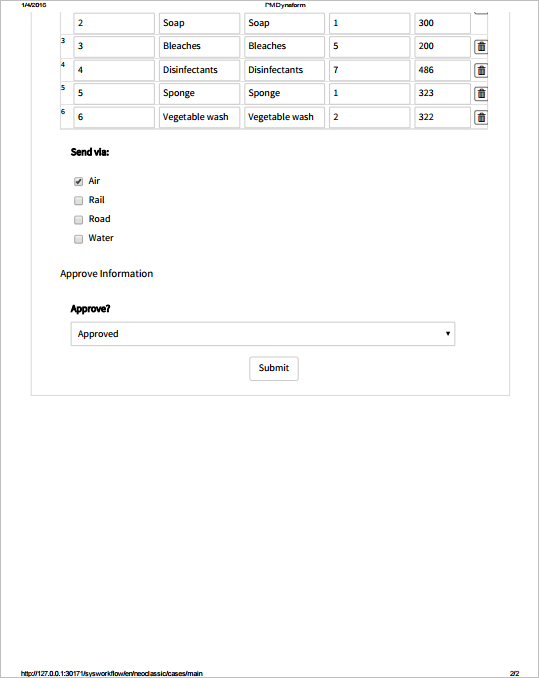 Click on this icon to print the form. All current content in the form will be printed, no matter how extensive the form is. The page header contains the current date at the top left corner, with the "PMDynaform" text in the center. The footer contains the URL address where it was printed from.