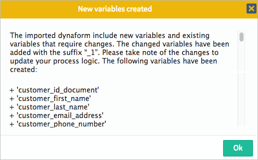 Additionally, the import process scan the variables that are related to the dynaform controls and defined in the process with the variables that are included in the .JSON definition of the dynaform that is being imported.