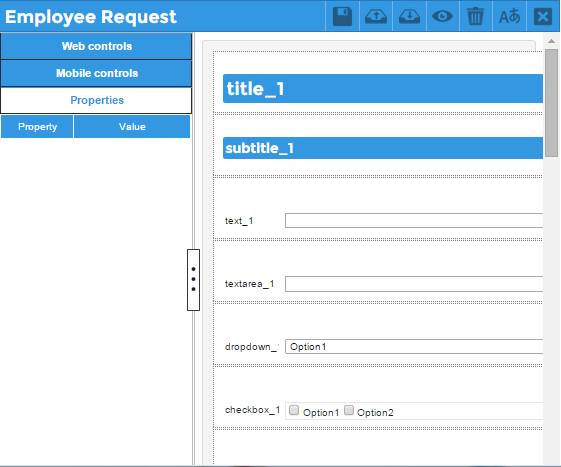 By clicking on this option a .json file downloads containing the definition of the controls and properties included in the form. The name of the file has the format NameDynaForm.json. The elements downloaded in the file are: