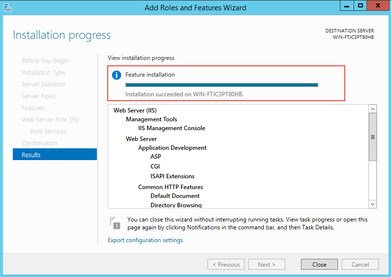 Once the IIS installation completes, the wizard will reflect the installation status.