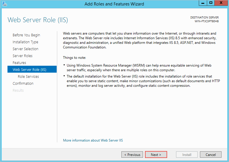 On the next dialog, information about Web Server Role (IIS) will be introduced. Click on Next to continue.