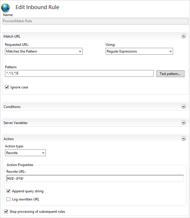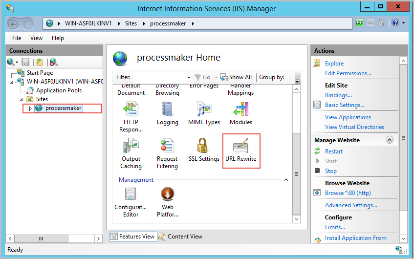 In the "Internet Information Services (IIS) Manager" main window, select the new site created "processmaker" and in the "processmaker Home" section, make double-click on URL Rewrite.