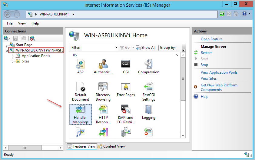 After that, go to “Internet information Service Manager”, select the current server and open the option Handler Mappings.