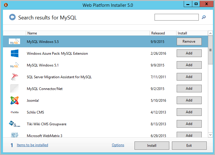 When the results are shown, select MySQL 5.5, click on Add and then click on Install at the bottom of the window.